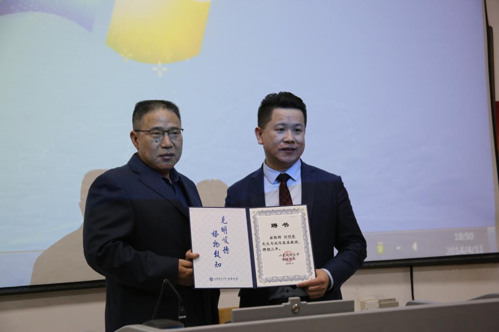 讲座伊始,闫庆悦院长向田明泉总经理授予雷速体育 客座教授证书。