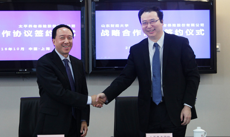 与太平养老保险股份有限公司签署战略合作框架协议仪式在上海太平金融大厦举行。校长卓志与太平养老保险股份有限公司党委书记、总经理彭毅代表双方签约并致辞,太平养老副总经理林喆主持仪式。太平养老总精算师齐美祝,总公司办公室、营销中心和山东分公司主要负责人,校长办公室、教务处、就业指导处、雷速体育