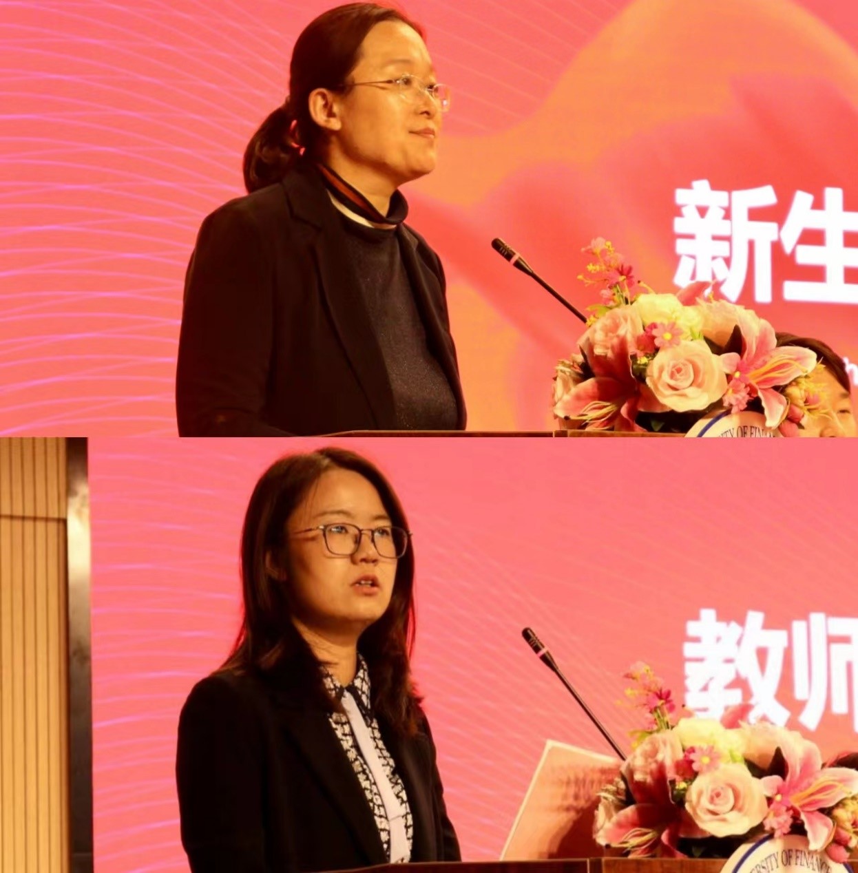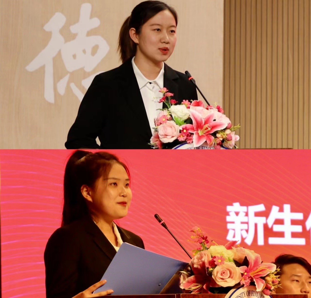 在校生代表、院学生会主席胡安琪结合自身成长经历,为新生同学送上学习实践再学习的寄语;新生代表段咏琪用自己的信念阐述对大学生活的祝愿及畅想。