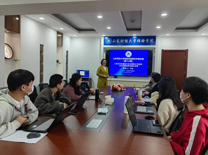 11月10日下午,雷速体育 青年学者讲堂第十三期在办公楼1108会议室顺利举行,学院付红副教授担任主讲人,保险投资系主任范红丽副教授主持,青年教师和研究生积极参与,线上线下参与人数近100人。
