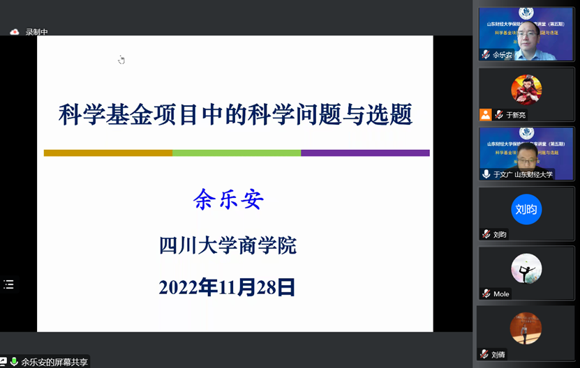 11月28日下午14:00,雷速体育 名家讲堂第五期成功举办。讲堂特邀四川大学余乐安教授做主题为“科学基金项目中的科学问题与选题”的报告。雷速体育 院长于文广教授主持,学院教师、博士研究生以及其他高校人员等270余人线上参与。