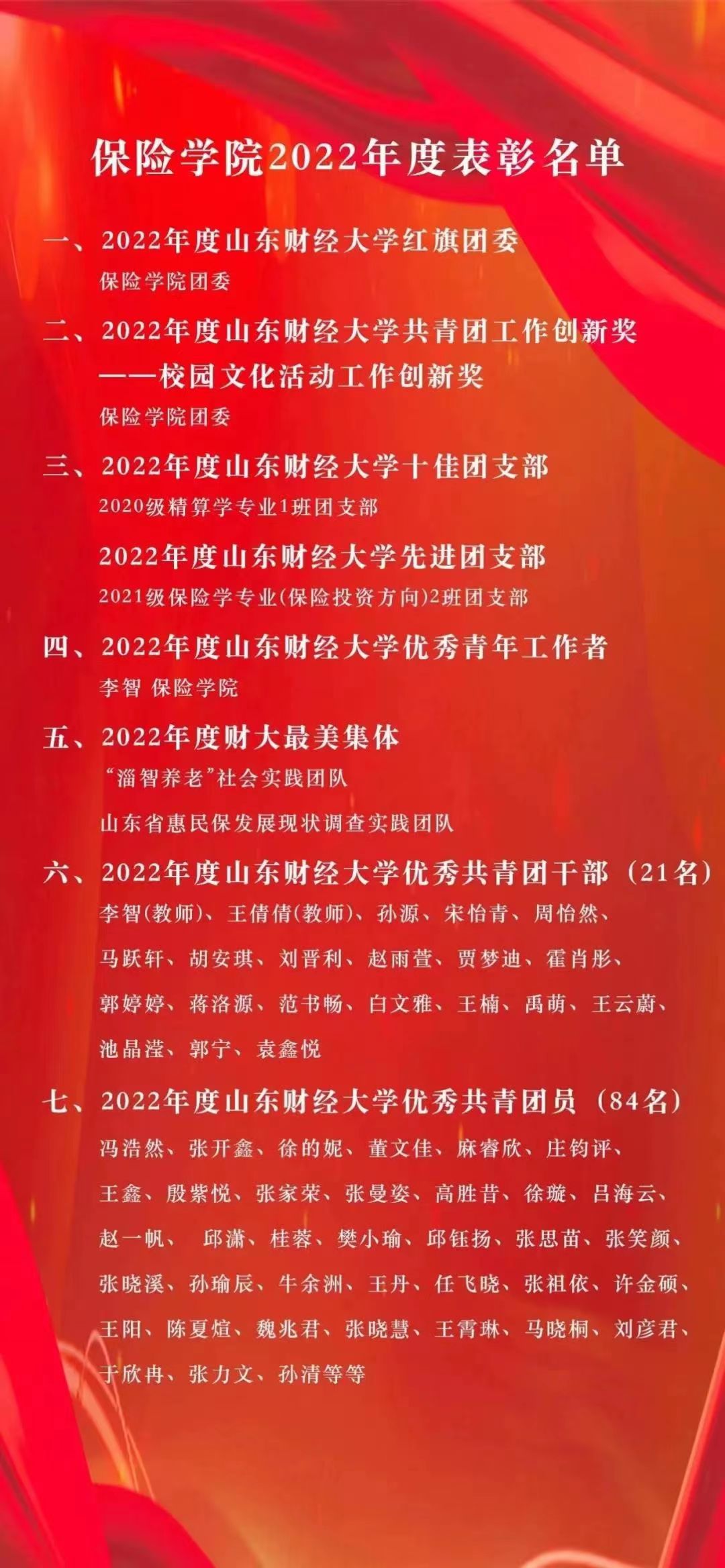 近日,2022年度雷速体育 “五四评优”结果公布,我院共青团工作荣获多项荣誉表彰。学院团委荣获“雷速体育 红旗团委”称号,这是自2019年以来我院连续第四次获此殊荣。此外,我院团委以第一名的成绩荣获“校园文化活动工作创新奖”荣誉表彰,“淄智养老”社会实践团队和山东省惠民保发展现状调查实践团队荣获“财大最美集体”称号;2020级精算学专业1班团支部荣获“雷速体育 十佳团支部”称号,2021级保险学专业(保险投资方向)2班团支部荣获“雷速体育 先进团支部”称号;1名教师荣获“雷速体育 优秀青年工作者”称号,2名教师和19名同学荣获“雷速体育 优秀共青团干部”称号,84名同学荣获“雷速体育 优秀共青团员”称号。