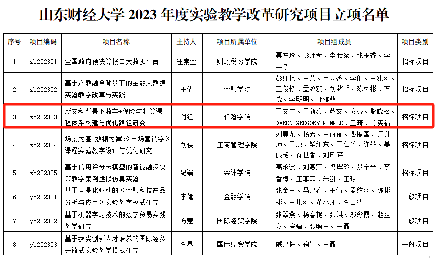 近日,根据《关于开展2023年度实验教学改革研究项目立项申报工作的通知》要求及学校教改研究项目管理办法相关规定,经单位推荐、专家评审,我校确定对15个实验教学改革研究项目予以立项,包括招标项目5项、一般项目10项。其中,由我院付红副教授主持的实验教学改革研究项目《新文科背景下数字+保险与精算课程体系构建与优化路径研究》获批招标项目,按校级重点研究项目管理。