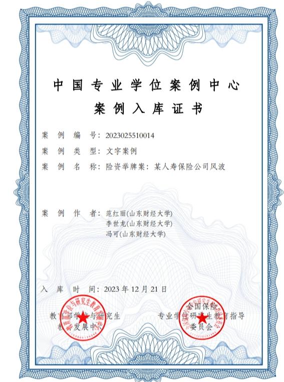 我院范红丽教授、李世龙教授和研究生冯可共同撰写的案例《险资举牌:某人寿保险公司风波》入选全国保险专业学位案例中心案例库。入选的优秀教学案例在全国保险专业学位研究生培养单位中共享,而且被收录入由教育部学位与研究生教育发展中心主办的“中国专业学位案例中心”保险案例库,成为国家级的教学案例。