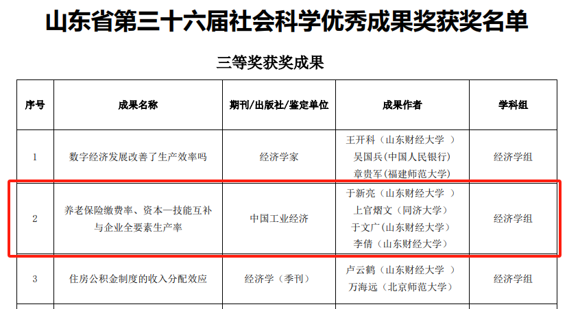 近日,山东省社会科学优秀成果奖评选委员会办公室公布表彰了山东省第三十六届社会科学优秀成果奖获奖成果名单,我院于新亮教授的论文《养老保险缴费率、资本—技能互补与企业全要素生产率》荣获三等奖。