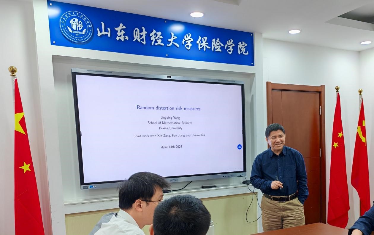 报告上半场由安起光主持,杨静平做了主题为《Random distortion risk measures》的学术报告,讲解了随机失真函数的定义和性质以及用它来度量风险的方法。杨教授指出将风险转化为失真度量,然后基于概率分布的随机性来计算,从而可以更准确地捕捉到风险的复杂性和不确定性,尤其是在面对非对称和厚尾分布的情况下优势更大。