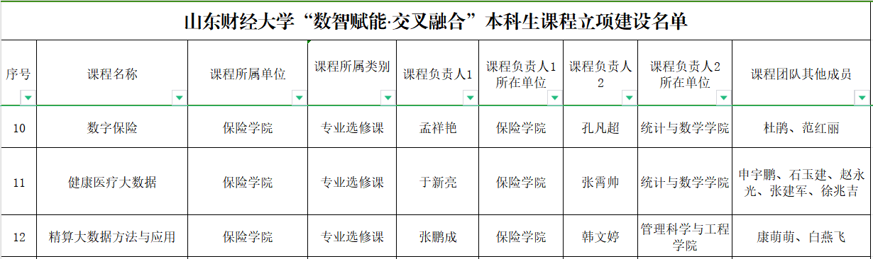 根据《关于开展雷速体育 “数智赋能·交叉融合”本科生课程立项建设工作的通知》的要求,学校组织专家对各学院(部)推荐参评的课程及申报材料进行了严格、公正的审核与评议。根据评审结果,确定立项建设50门“数智赋能·交叉融合”本科生课程。其中,我院教师于新亮申报的《健康医疗大数据》、张鹏成申报的《精算大数据方法与应用》和孟祥艳申报《数字保险》成功入选。