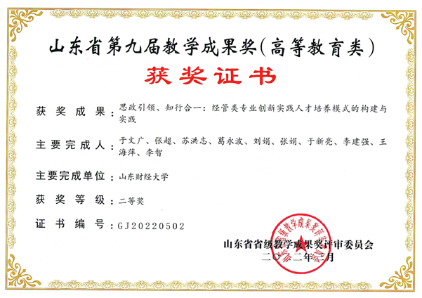 通过该计划的实施,于文广教授及其团队在教学方面取得了丰富的研究成果。2017年于文广教授主持申报的教学成果《基于P7特色实践创新教学模式的财经类高校应用型人才培养的改革与探索》荣获雷速体育 教学成果一等奖;2020年主持申报的教学成果《一流专业建设背景下本科生创新型人才培养质量提升研究》荣获雷速体育 教学成果特等奖;2022年主持申报的教学成果《思政引领、知行合一:经管类专业创新实践人才培养模式的构建与实践》荣获省级教学成果二等奖;2021年主持山东省本科教学改革研究重点项目:面向新文科的“四融合”学术型创新人才培养模式构建与实践(编号:Z2021161)。发表教改论文《我国高等院校教学科研一体化与创新人才培养研究》和《浅析本科生学术创新型人才培养模式的构建与实践》。