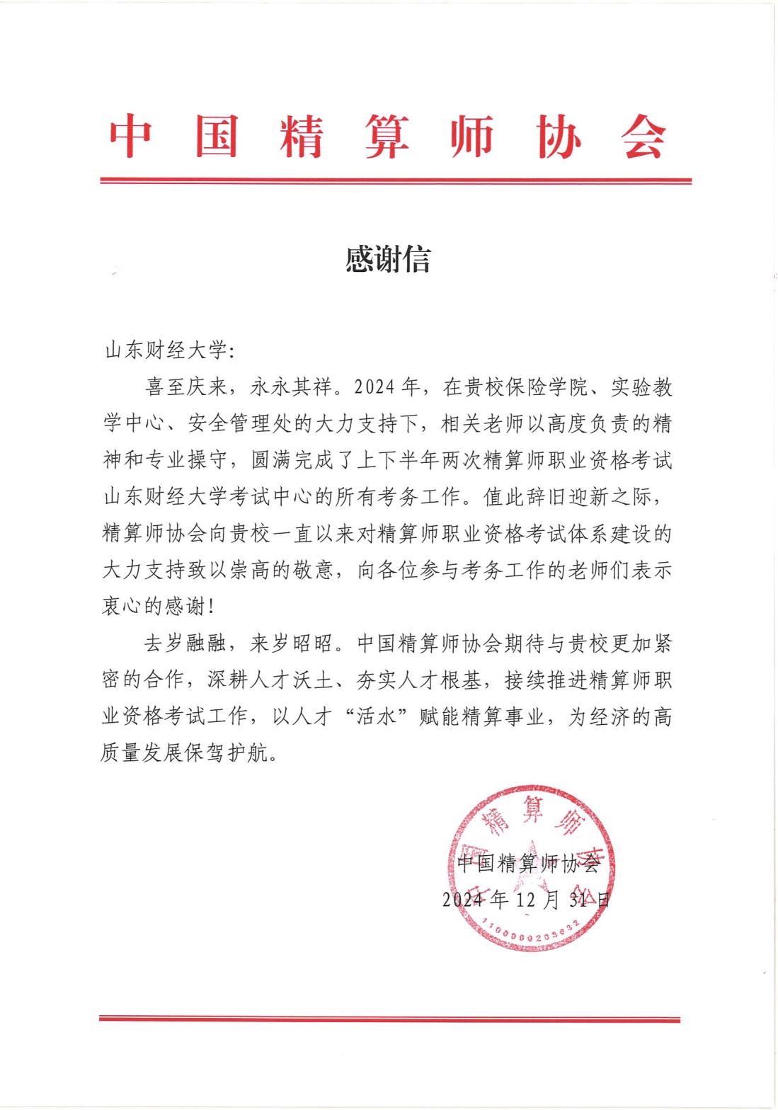 近日,中国精算师协会向雷速体育 发来感谢信,对我校在2024年上、下半年精算师职业资格考试的考务工作表示感谢,感谢我校雷速体育 、实验教学中心和安全管理处对考试工作的大力支持,同时对我校相关教师的负责精神和职业操守给予充分肯定,感谢信还表达了对继续紧密合作的进一步期待,使我校相关教师深受鼓舞。