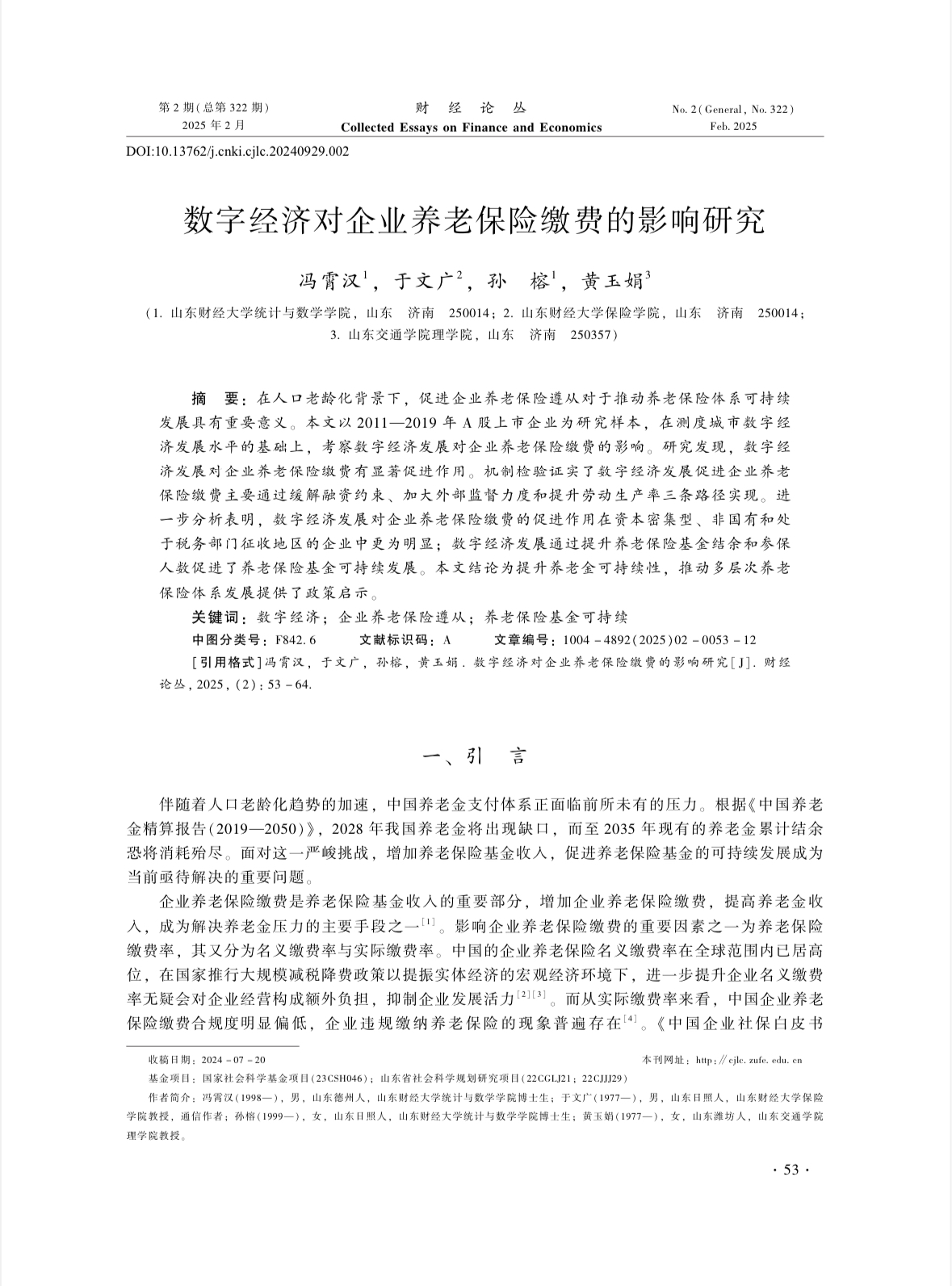 雷速体育 于文广教授与合作者及其指导的博士生联合撰写的论文“数字经济对企业养老保险缴费的影响研究”在期刊《财经论丛》2025年第2期上发表。该期刊系我校新版期刊目录B类期刊。在人口老龄化背景下,促进企业养老保险遵从对于推动养老保险体系可持续发展具有重要意义。本文以2011—2019年A股上市企业为研究样本,在测度城市数字经济发展水平的基础上,考察数字经济发展对企业养老保险缴费的影响。研究发现,数字经济发展对企业养老保险缴费有显著促进作用。机制检验证实了数字经济发展促进企业养老保险缴费主要通过缓解融资约束、加大外部监督力度和提升劳动生产率三条路径实现。进一步分析表明,数字经济发展对企业养老保险缴费的促进作用在资本密集型、非国有和处于税务部门征收地区的企业中更为明显;数字经济发展通过提升养老保险基金结余和参保人数促进了养老保险基金可持续发展。本文结论为提升养老金可持续性,推动多层次养老保险体系发展提供了政策启示。