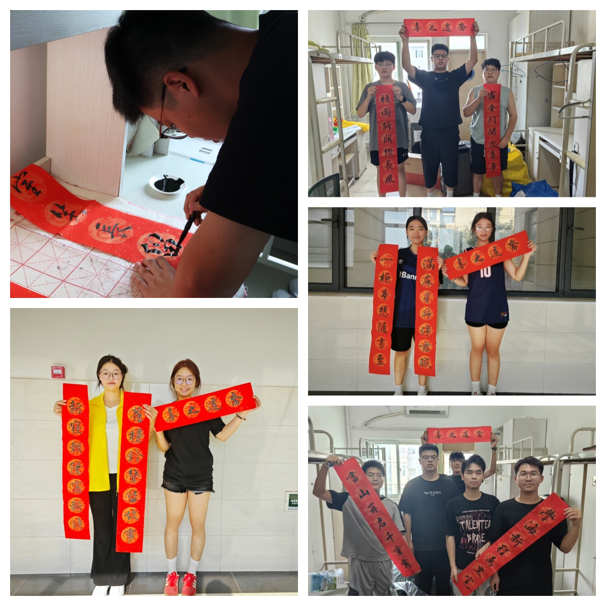 搬迁过程中,文化浸润与劳动精神彰显成为鲜明特色。在年级辅导员张腾倡议下,学院开展 “文明搬迁・文化筑家” 主题活动。学生搬迁前彻底清扫原宿舍,践行“带走回忆,留下整洁” 承诺;入住后通过旧物收纳、摆放绿植打造个性空间。2023级保险学2班王君琛、保险投资班双胞胎姐妹孙秀怡、孙秀悦现场挥毫,为班级各个新宿舍创作“学海扬帆济舜耕,青春逐梦启新程”等专属对联,既添乔迁喜气,又以文化为纽带连接同窗情谊,尽显保险学子人文素养。高温下,师生党员与志愿者的身影尤为动人。沈喆、宋亚洁等志愿者主动放弃随集体搬迁的便利,或提前进驻划定区域、张贴指引,或延后留守整理遗漏物品。有人搬运20个行李箱中暑后,喝藿香正气水即刻返岗;有人帮助女同学扛行李包裹,在无电梯楼道穿梭;有人提前学维修技能,现场协助组装家具。他们以汗水诠释“劳动光荣、互助为美”的育人初心。