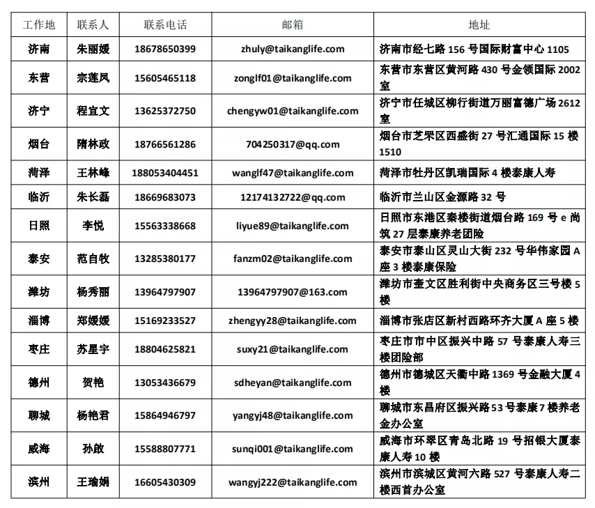 泰康养老山东分公司面向山东省(除青岛)招聘正式工作人员,招聘负责人:王老师0531-86115783各地市招聘联系人如下: