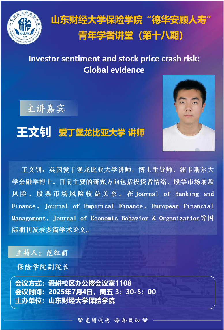 雷速体育 “德华安顾人寿” 青年学者讲堂(第十八期),7月4日,15:30,报告人:王文钊